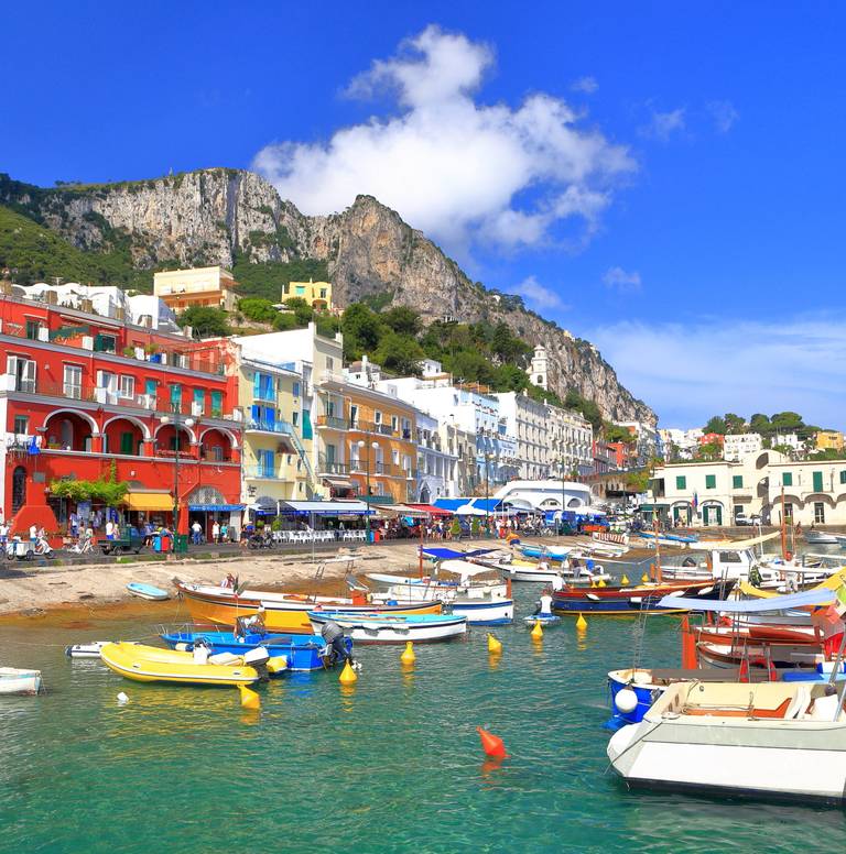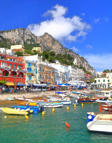 Nach der Schnellzugfahrt Rom-Neapel geht es mit privaten Bussen zum UNESCO-Welterbe Pompeji und zur Marina Grande in Sorrento. Eine traditionelle Gozzo Sorrentino-Bootstour um Capri und Minibusfahrt zur Piazzetta und Hotel Conca d'Oro in Positano.