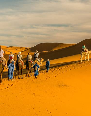 Die hohen Dünen des Erg Chebbi nahe Merzouga bilden die Kulisse dieser Sahara-Tour. Traditionelles Nomadenleben mit Kameltouren, Sandboarding und Übernachtungen unter funkelndem Sternenhimmel.